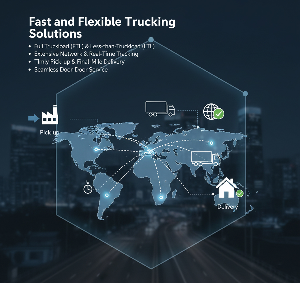Keep your cargo moving nationwide with our fast and flexible trucking solutions. We offer a range of reliable options, from full truckload (FTL) to less-than-truckload (LTL), to meet your specific schedule and budget. Our extensive network and real-time tracking provide visibility and control, ensuring timely pick-up and final-mile delivery for seamless door-to-door service.